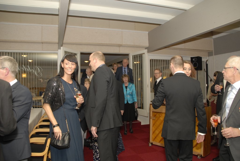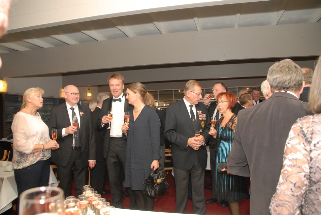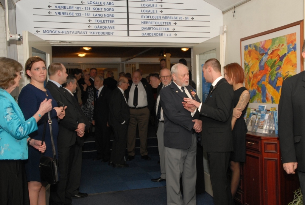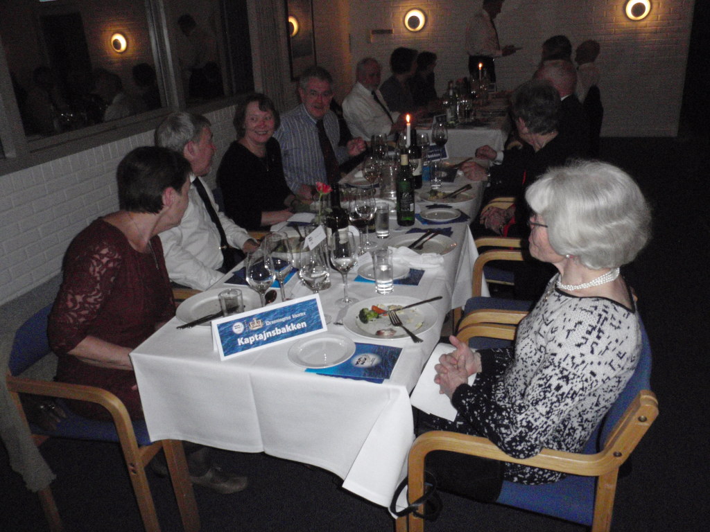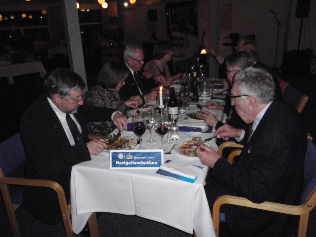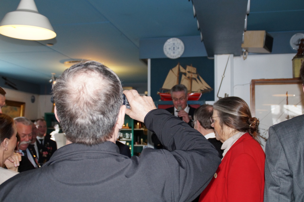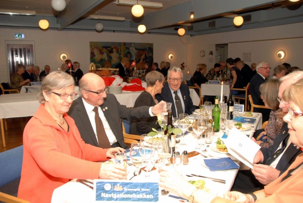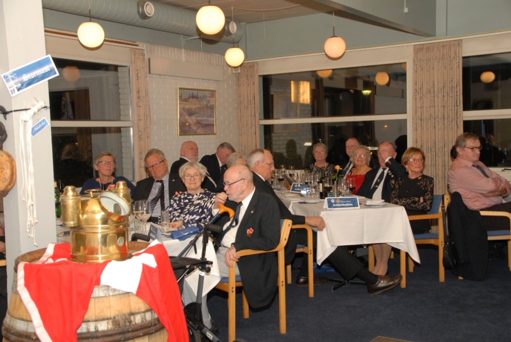 Stuen var fyldt til bristepunktet, ca. 200 gæster. Efter velkomst af formand Erich H. Franzen overtog tidl. formand, æresmedlem Jørgen Brøgger hvervet som toastmaster. - Der blev serveret "Marlenes luksus-canapéer", hvid Ebeltoft Marinevin, øl og vand.