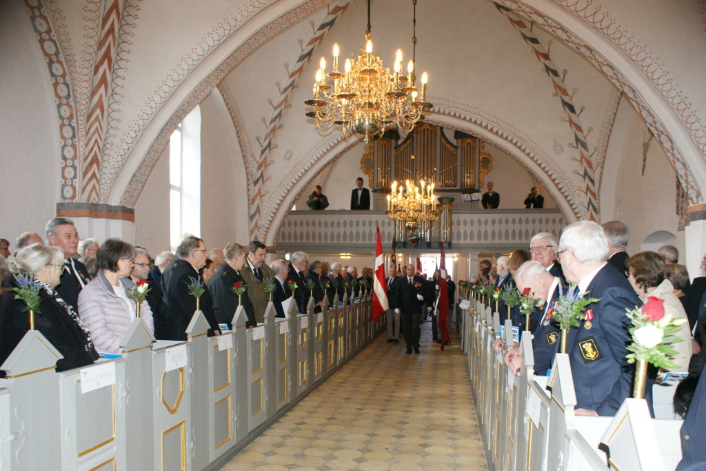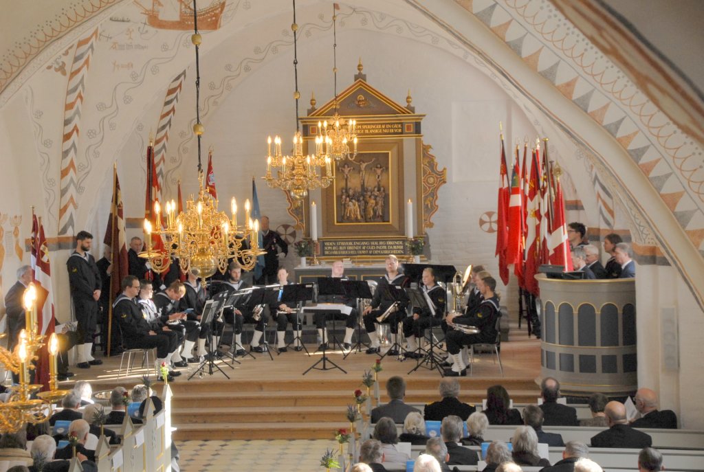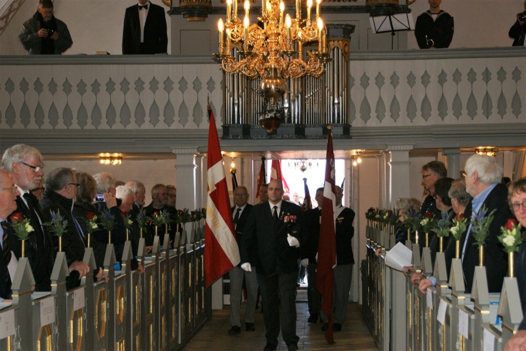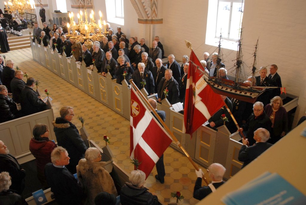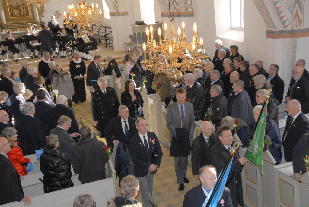 På slaget 11.00 gik dørene til våbenhuset op, og Tamburklorpset istemte "La Rejouissance" af G.F. Händel, - og samtidig kom 40 flag/faner langsomt ind i kirken og tog plads i koret, hvor også Tamburkorpset sad. Det var et meget stemningsfuldt øjeblik, der fik mangt et gråt nakkehår til at rejse sig, og flere garvede søfolk måtte diskret viske en dråbe væk fra øjenkrogen. - Selve Gudstjenesten var helt forrygende og virkelig en fest gudstjeneste. Provstens tale/prædiken var på een gang alvorsfuld og morsom, så mange kirkegængere måtte overgive sig og grine højlydt.