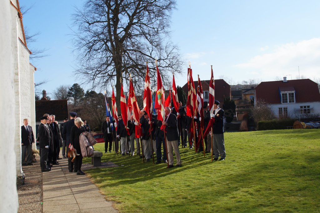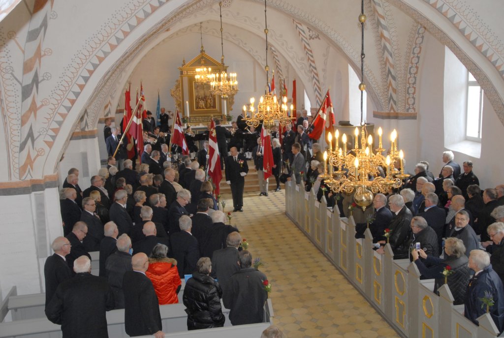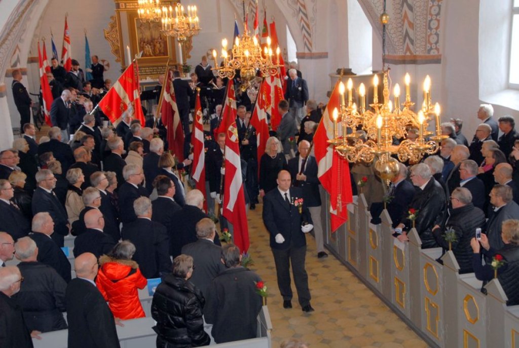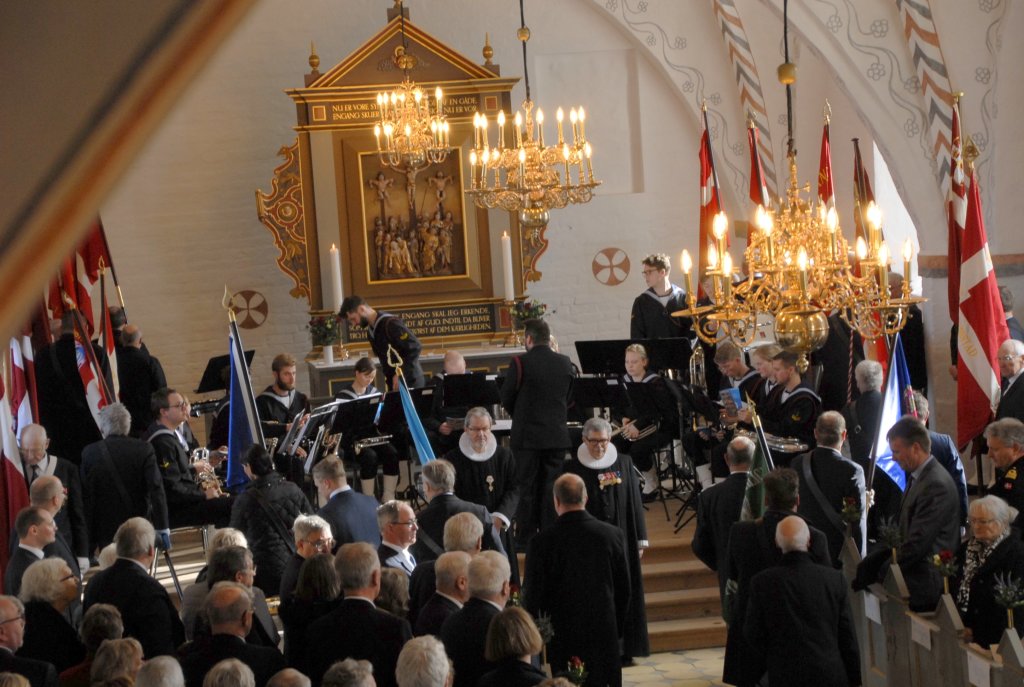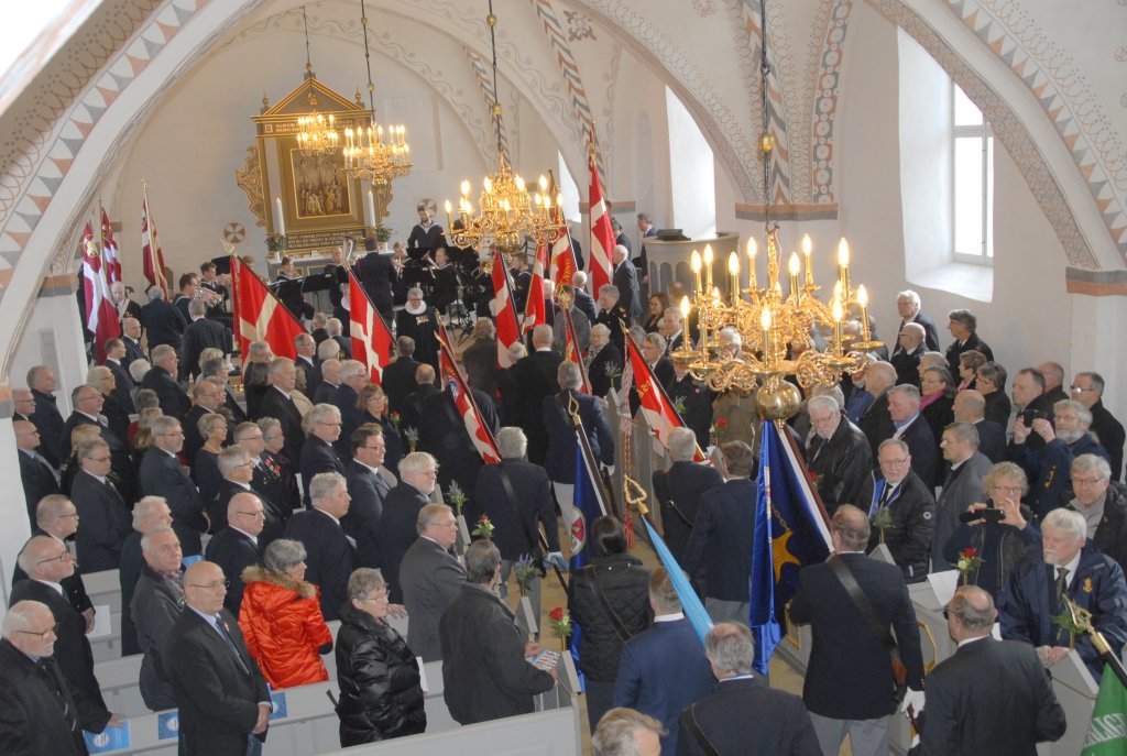 På slaget 11.00 gik dørene til våbenhuset op, og Tamburklorpset istemte "La Rejouissance" af G.F. Händel, - og samtidig kom 40 flag/faner langsomt ind i kirken og tog plads i koret, hvor også Tamburkorpset sad. Det var et meget stemningsfuldt øjeblik, der fik mangt et gråt nakkehår til at rejse sig, og flere garvede søfolk måtte diskret viske en dråbe væk fra øjenkrogen. - Selve Gudstjenesten var helt forrygende og virkelig en fest gudstjeneste. Provstens tale/prædiken var på een gang alvorsfuld og morsom, så mange kirkegængere måtte overgive sig og grine højlydt.