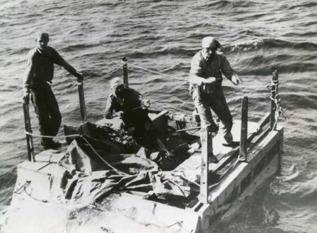 - 3 overlevende fra M/S Panama, der gik ned i hårdt vejr den 11. april 1945. Af den 45 mand store besætning, hvoraf 24 var danske, overlevede kun 5. Billedet er taget fra det britiske skib, der tog søfolkene op, efter at de havde drevet rundt på havet i 18 døgn.