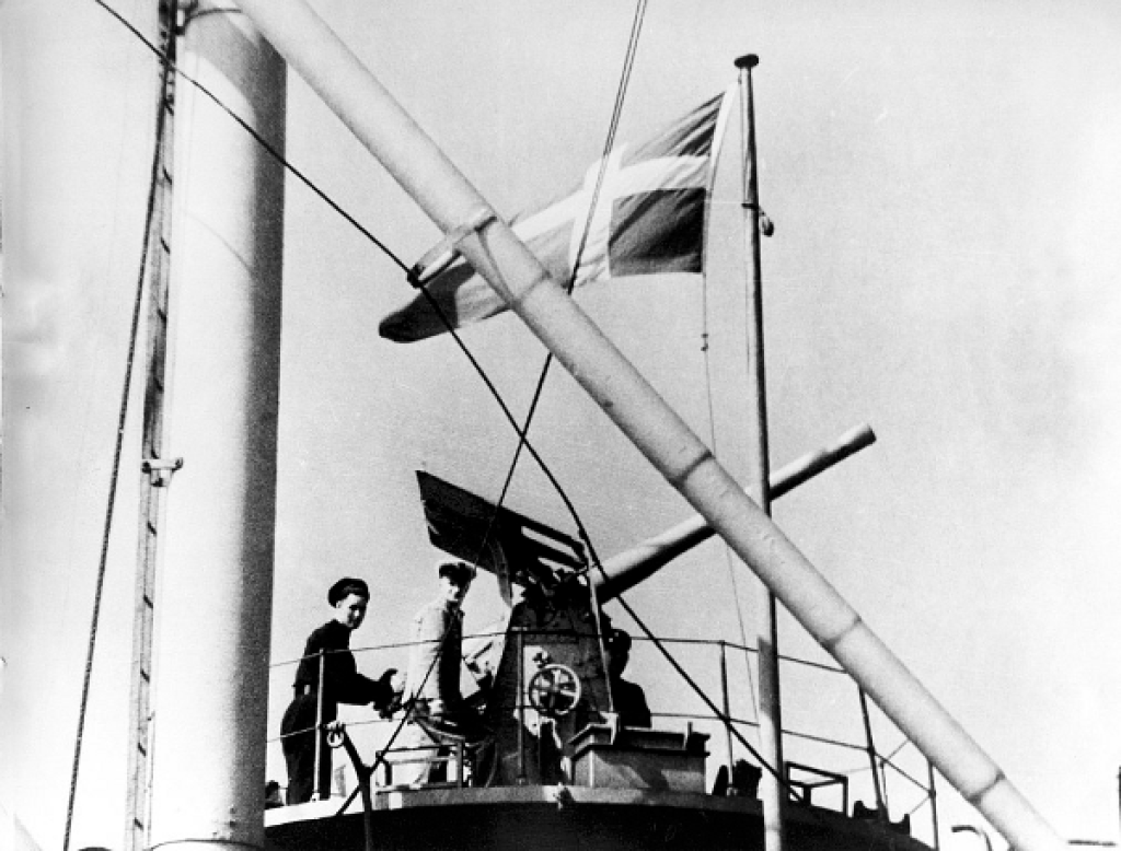- Danske krigssejlere ved kanonen på dansk skib efter 29. august 1943, hvor danske skibe igen fik lov at sejle under Dannebrog
