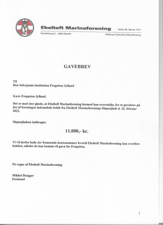 Gavebrev til Fregatten Jylland ved overrækkelsen af overskuddet fra Slupsejladsen 2022: