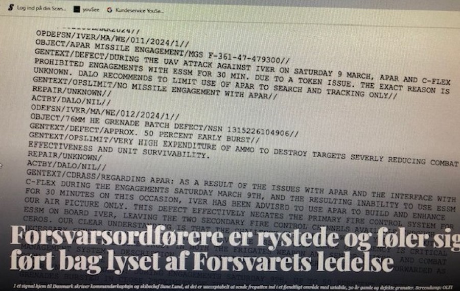 Man kan nærmest mærke den anspændte stemning i operationsrummet og forstå vreden i skibsledelsen. Dokumentet er et "NATO RESTRICTED" såkaldt signal sendt fra chefen for "Iver Huitfeldt" til en række militære myndigheder i Danmark, herunder Søværnskommandoen, Forsvarets Materiel- og Indkøbsstyrelse og skibsledelsen på Søværnets fire andre fregatter.