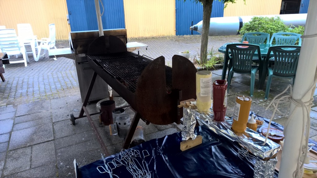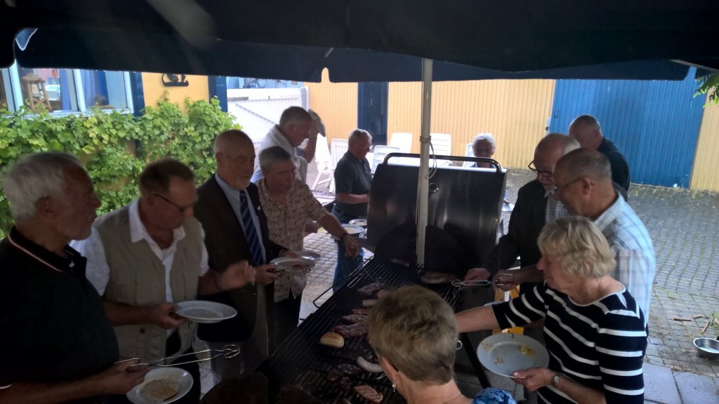 ..... og hvilken aften, det blev ! Der var 64 deltagere, og stemningen var fantastis, trods det i den grad våde vejr. Vi må nik indrømmer, at vejrguderne ikke var med os, men det var medlemmerne til gengæld. selv om regnen stod ned i stænger, var der godt gang i grillen, som i dagens anledning var blevet overdækket, mens spisningen måtte forgå indendøre.