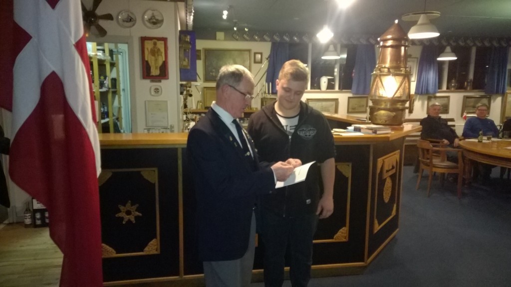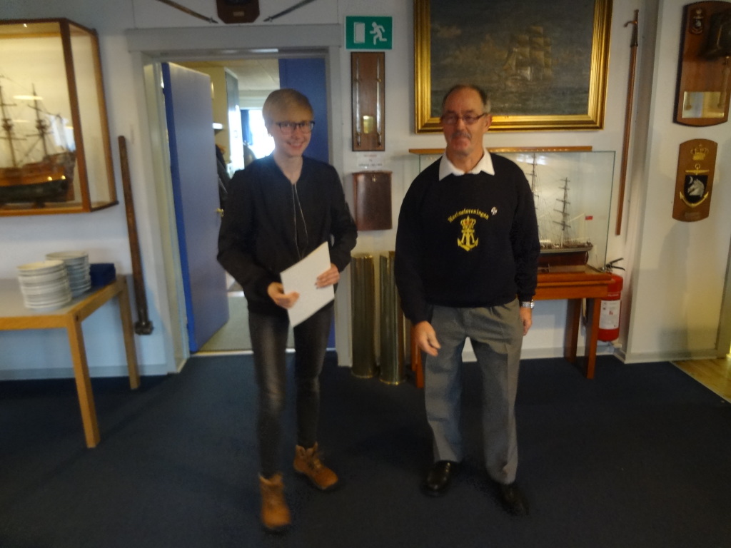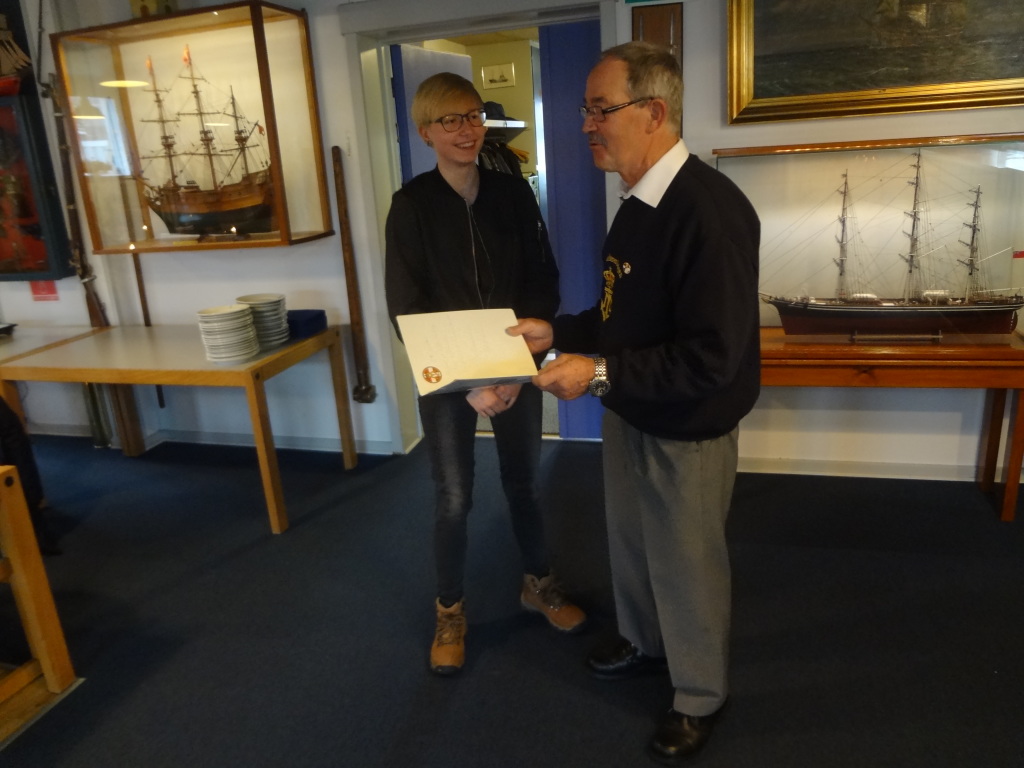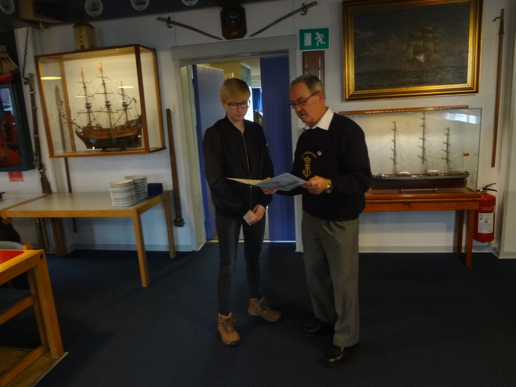 I forbindelse med sit 100-års jubilæum oprettede Ebeltoft Marineforening et fond til støtte for unge mennesker,fra Syddjurs Kommune, der vil have en søfartsuddannelse. - Den første uddeling fandt sted i forbindelse med lørdags-åbningen i Marinestuen den 21. oktober, hvor 18-årige Ea Vinkel fra Mols, der har skrevet uddannelseskontrakt som navigatør med Mærsk modtiog en donation på 2.000,- kr. til indkøb af lærebøger. Efter overdragelsen var Ea Vinkel inviteret på lørdagsfroksot sammen med bestyrelsesn repræsentanter.