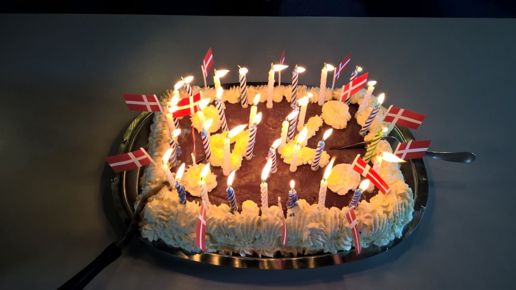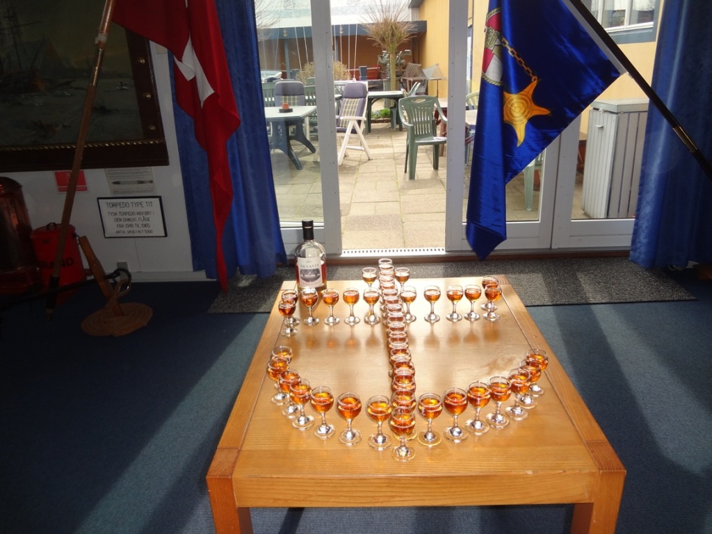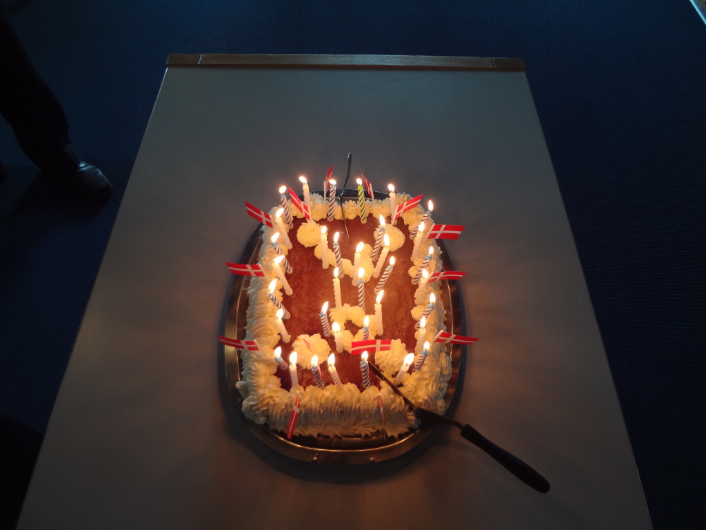 Den halvrunde fødselsdag blev (naturligvis) fejret som en sådan bør: Med velkomstdrink (Fregat- snaps opstillet i ankerfacon) og i kaffepausen to store lagkager med tilsammen 70 lys i.