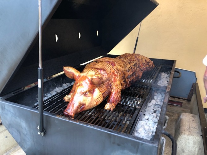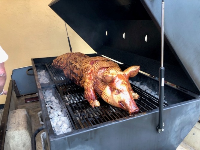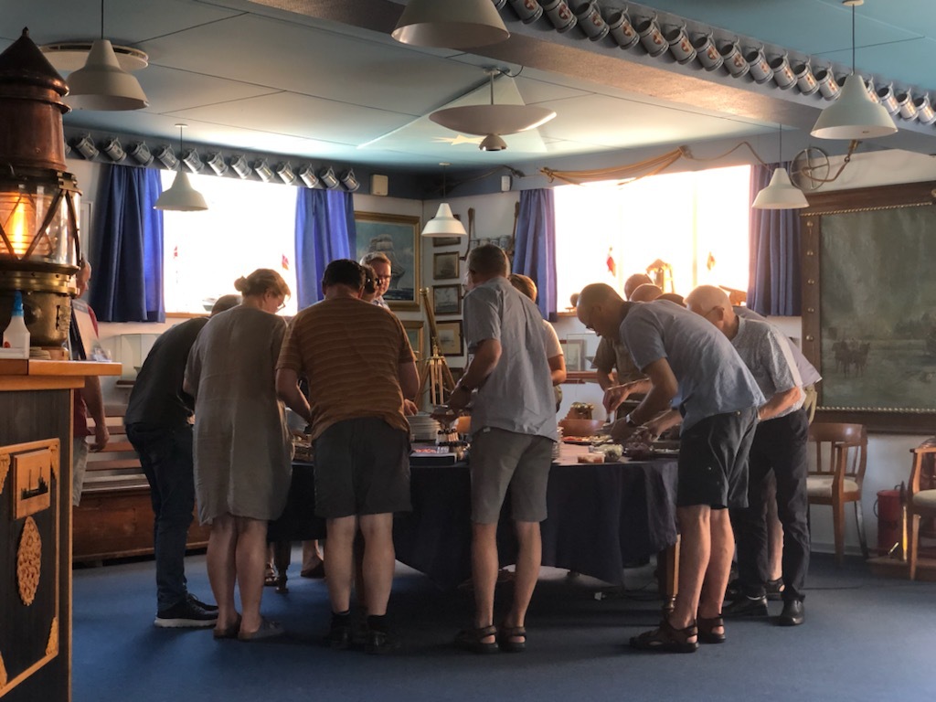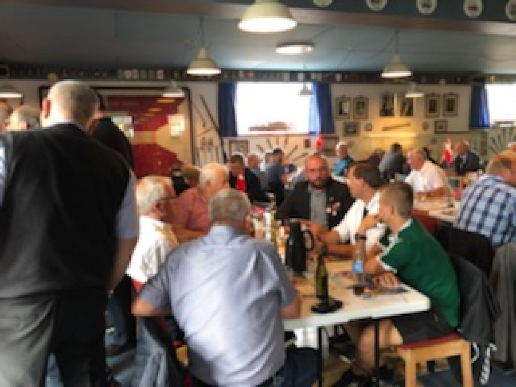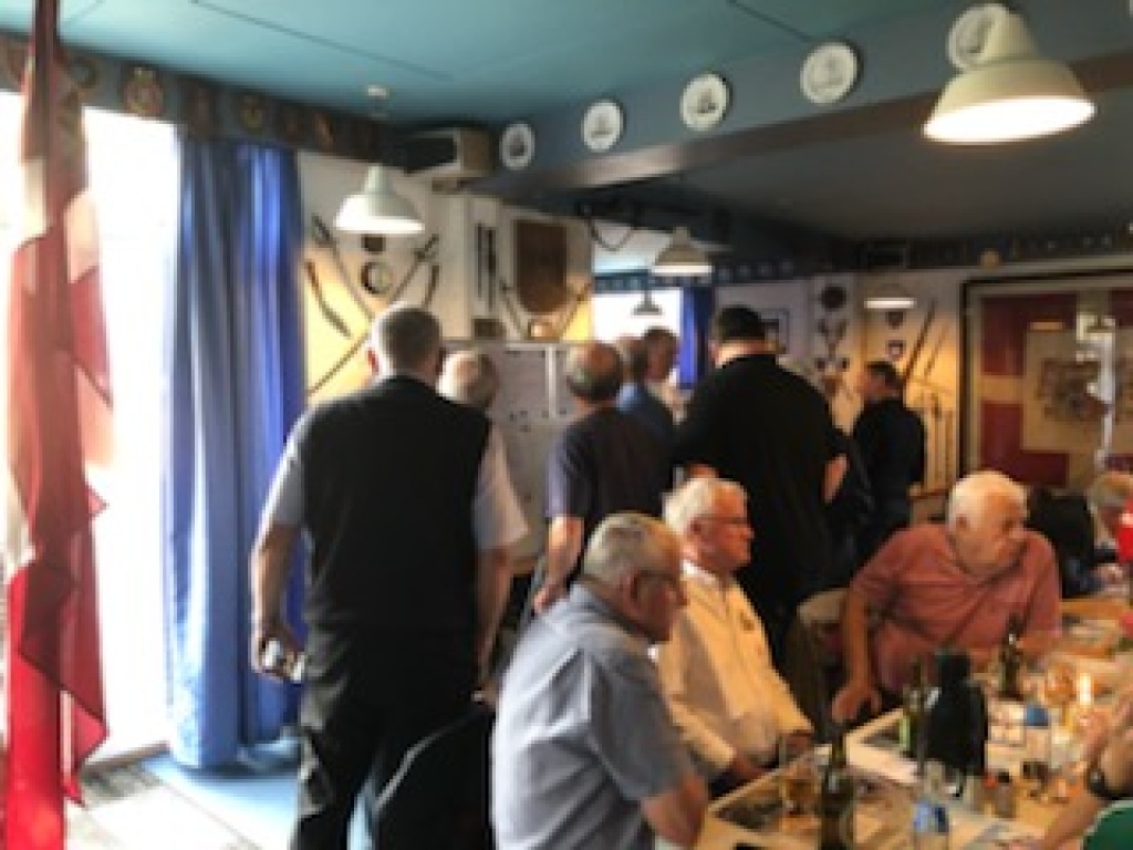 Lige knap 70 (67 for at være helt nøjagtig) glade deltagere havde fundet vej til Marinestuen og foreningens årlige "Sommerfest". Vejret var ikke det bedste , overskyet, "snusket" med egentlige byger indimellem, hvorfor der blev trukket indenfor i Marinestuen. Lidt ærgerligt selvfølgelig, uden at det dog gav skår i den gode og glade stemning.Der blev budt på helstegt pattegris med diverse tilbejør. Utroligt lækkert !