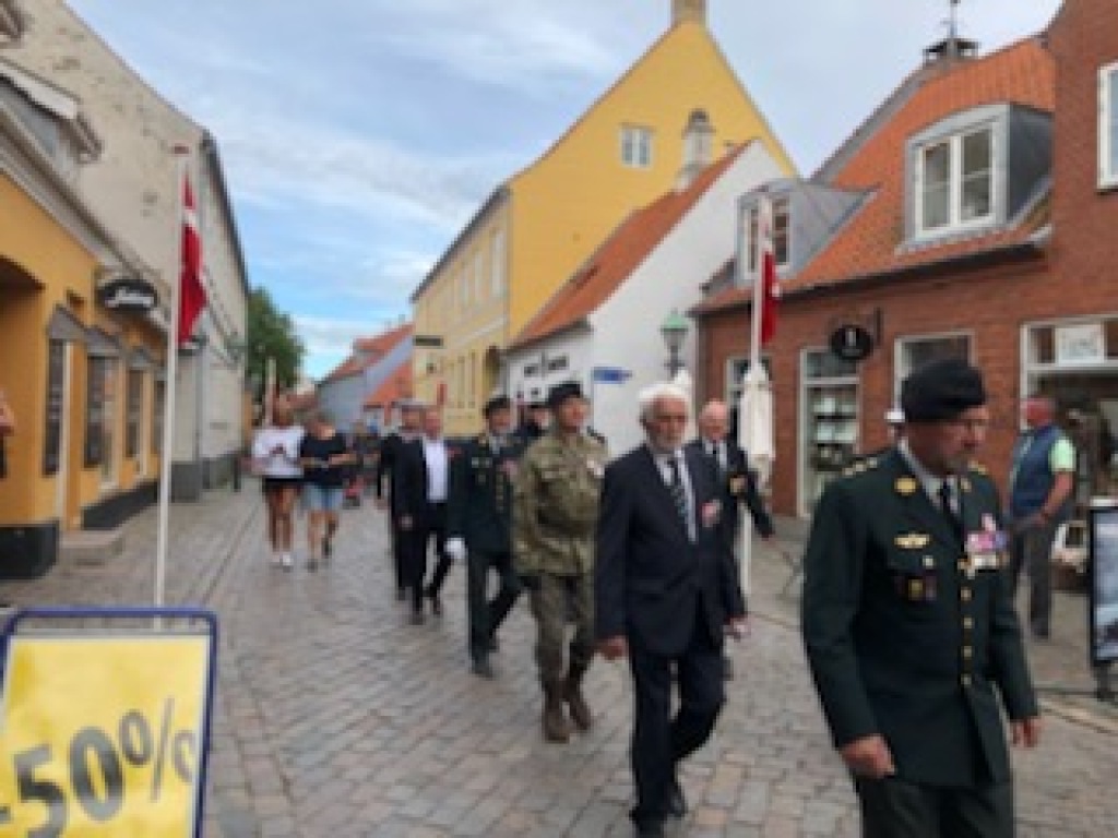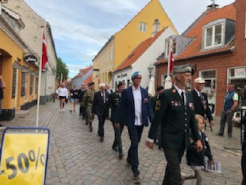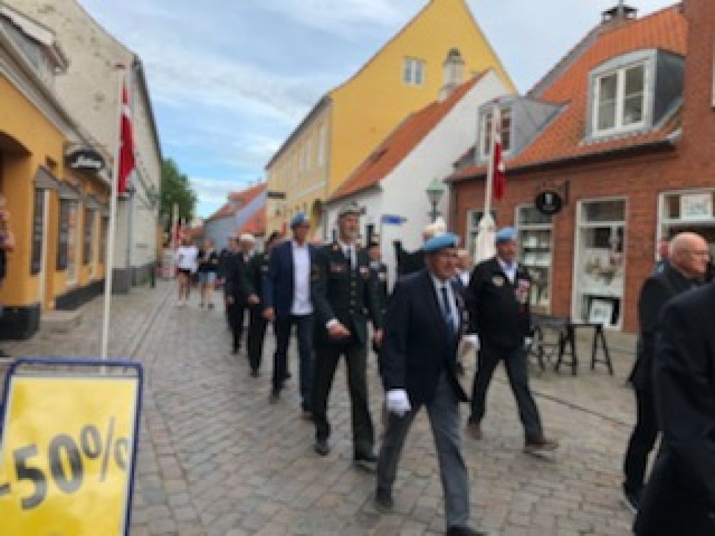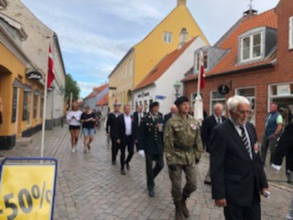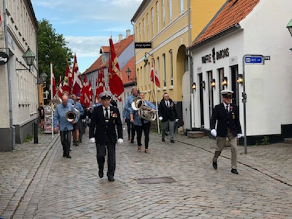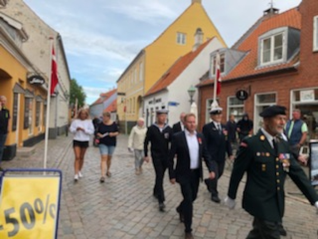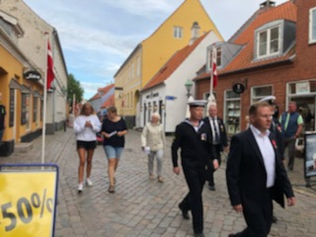 Gudstjenesten blev efterfulgt af march gennem byen ad ruten Kirkegade, Overgade, Torvet, Juulsbakke, Nedergade, Havnevej og til Marinestuen på Stockflethsvej.