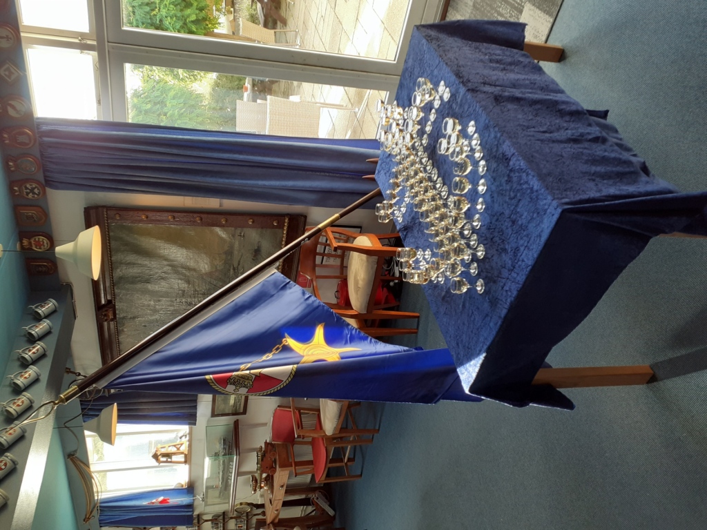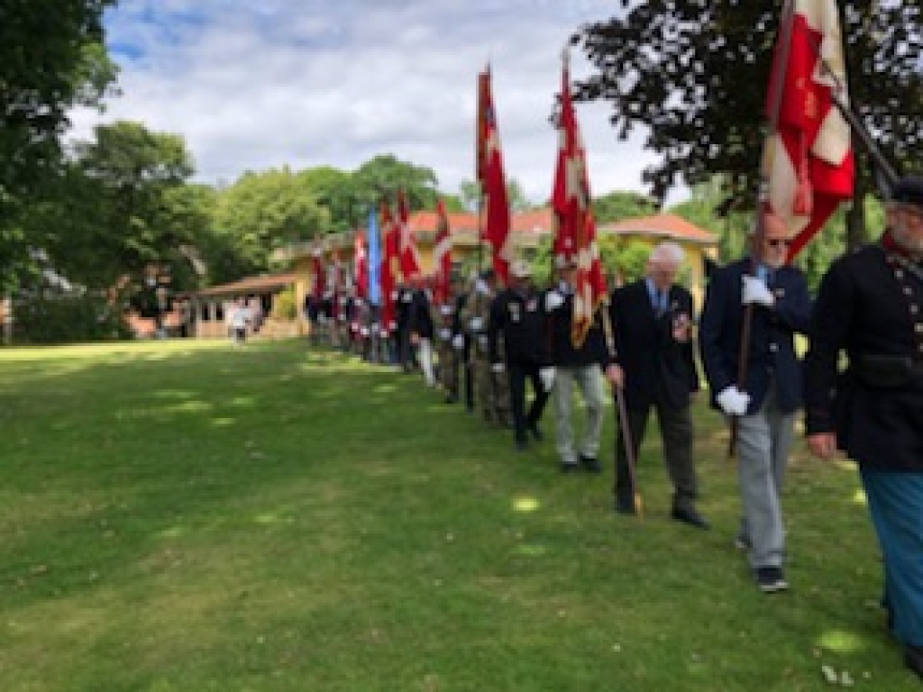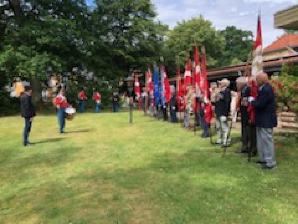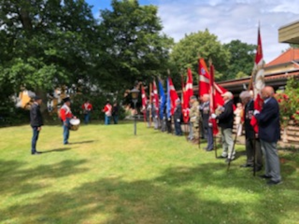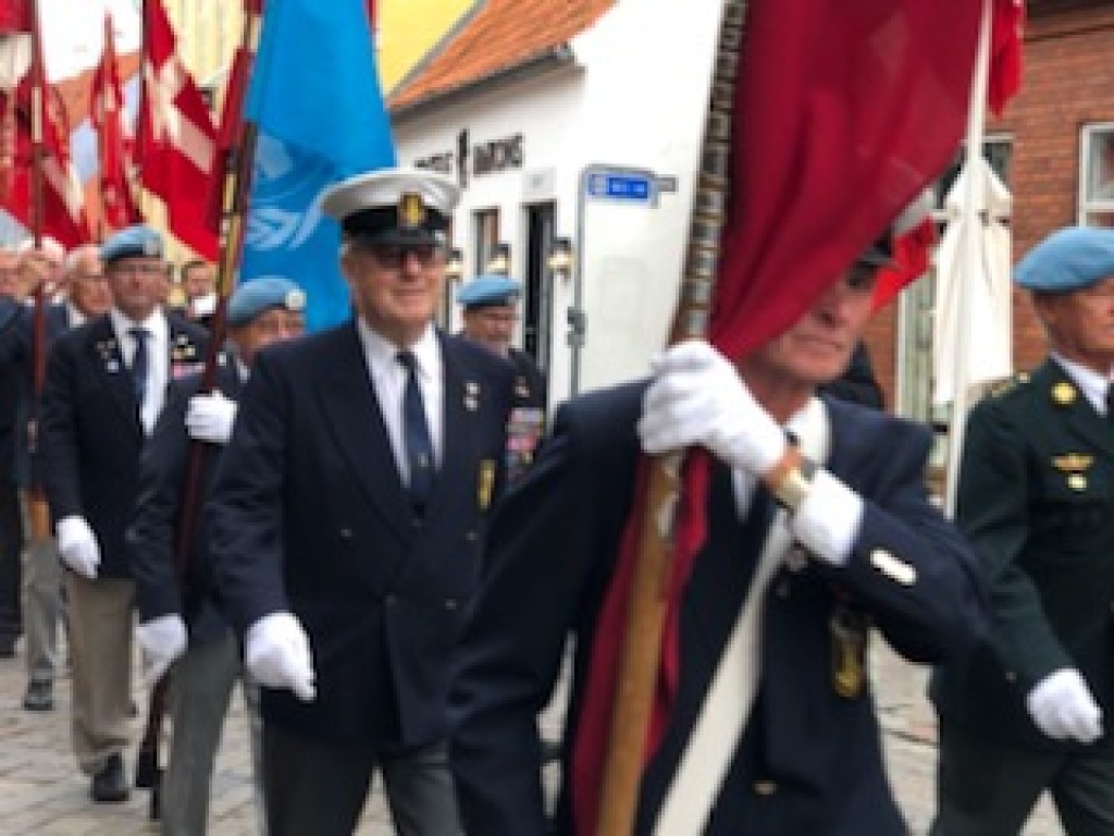 Flag-/faneborg med 16 flag/faner og parade med veteraner m.fl. Heriblandt ikke mindst glædeligt at se to unge orlogsgaster, der har været med Thetis ved "Hornet".