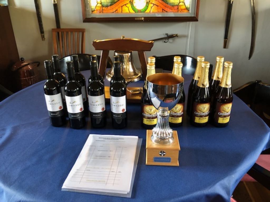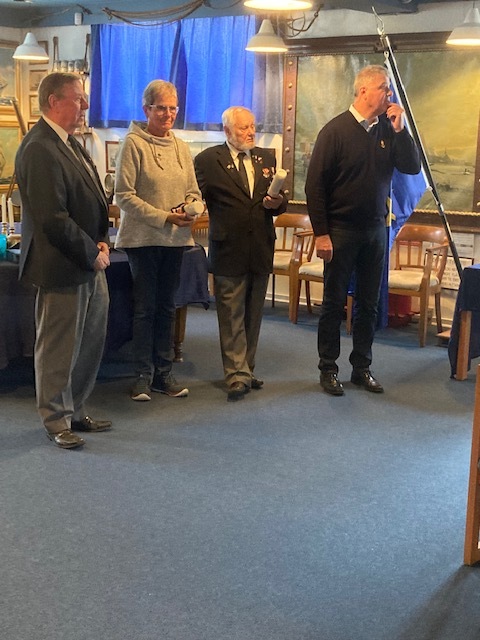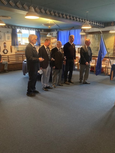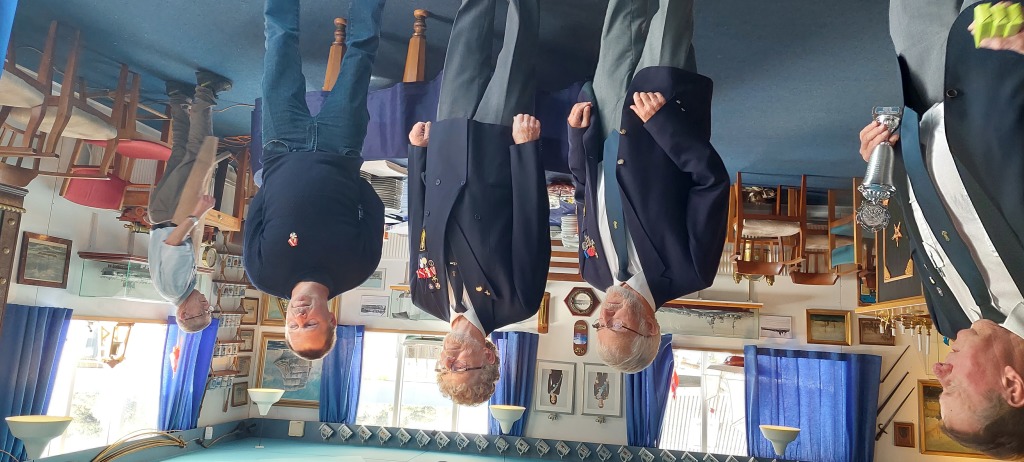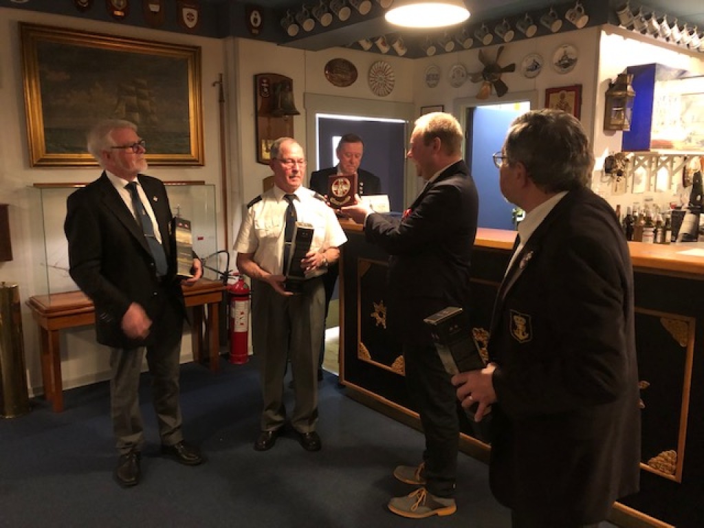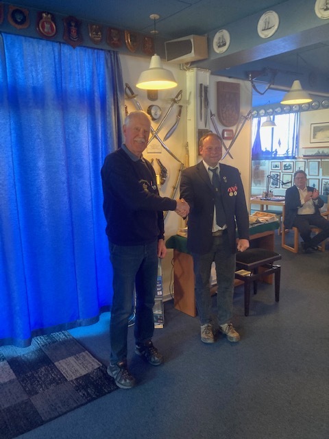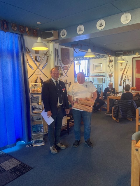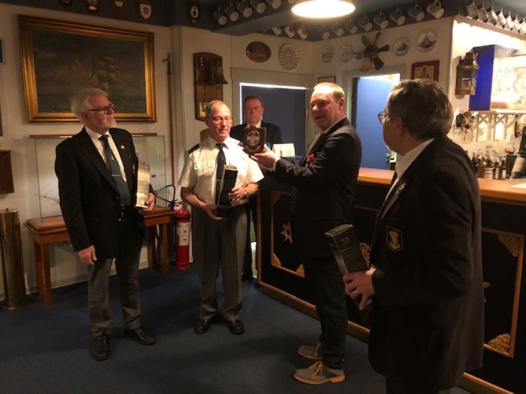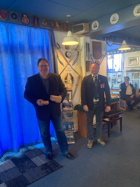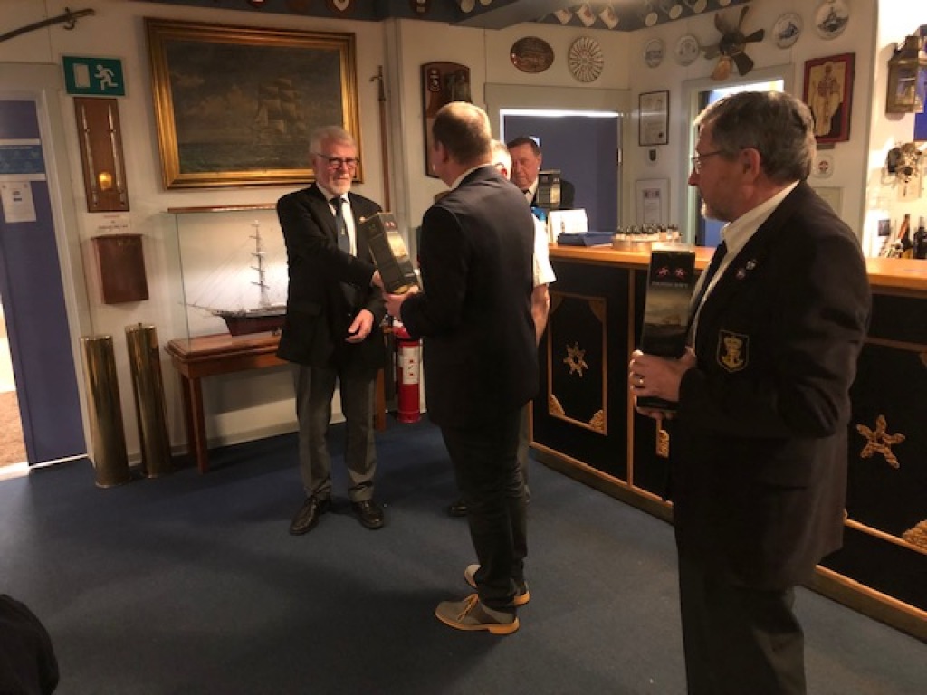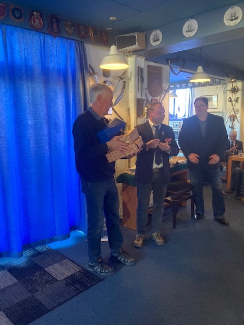 Den nye formand, Mikkel Brøgger takkede for valget og udtrykte ønsket om fremtidig støt og rolig kurs i foreningen og kaldte derefter de afgåede bestyrelse4smedlemmer frem og overrakte hver en flaske "Royal Danish Navy Rum", - og den afgåede formand tillige et våbenskjold fra Ebeltoft Marineforening.