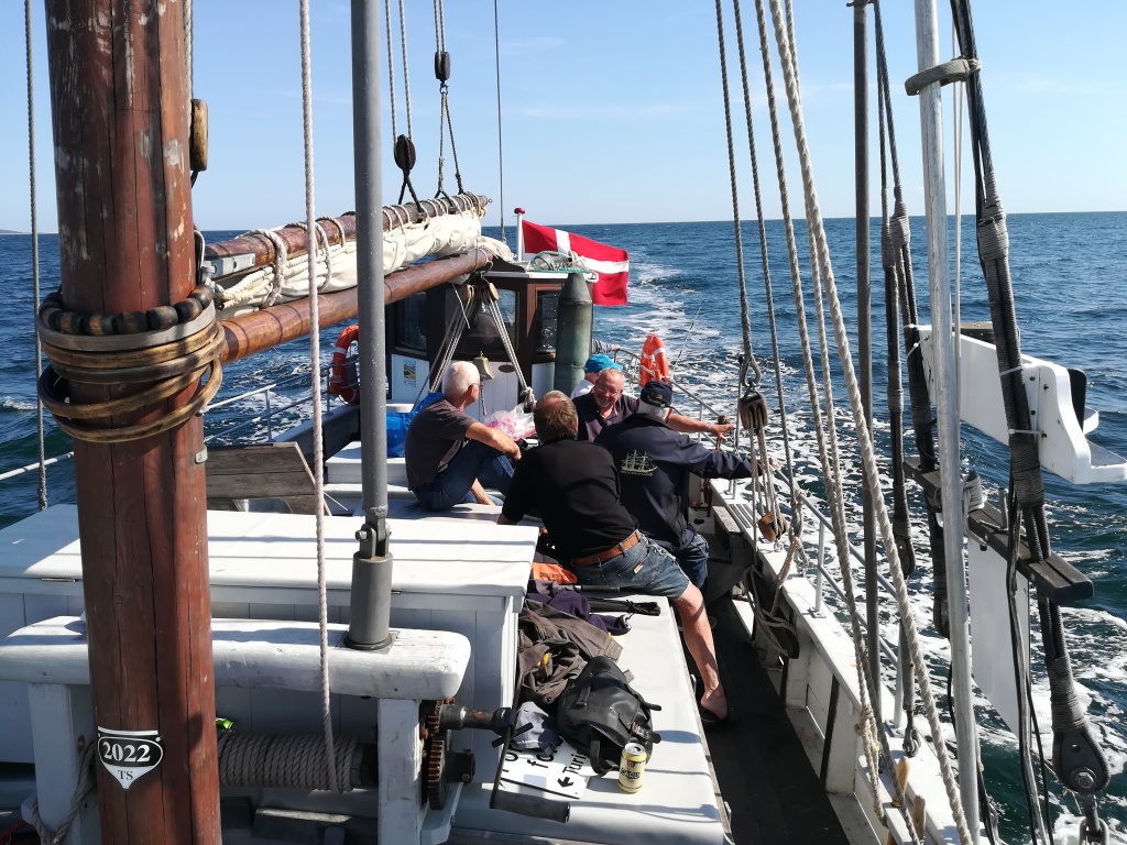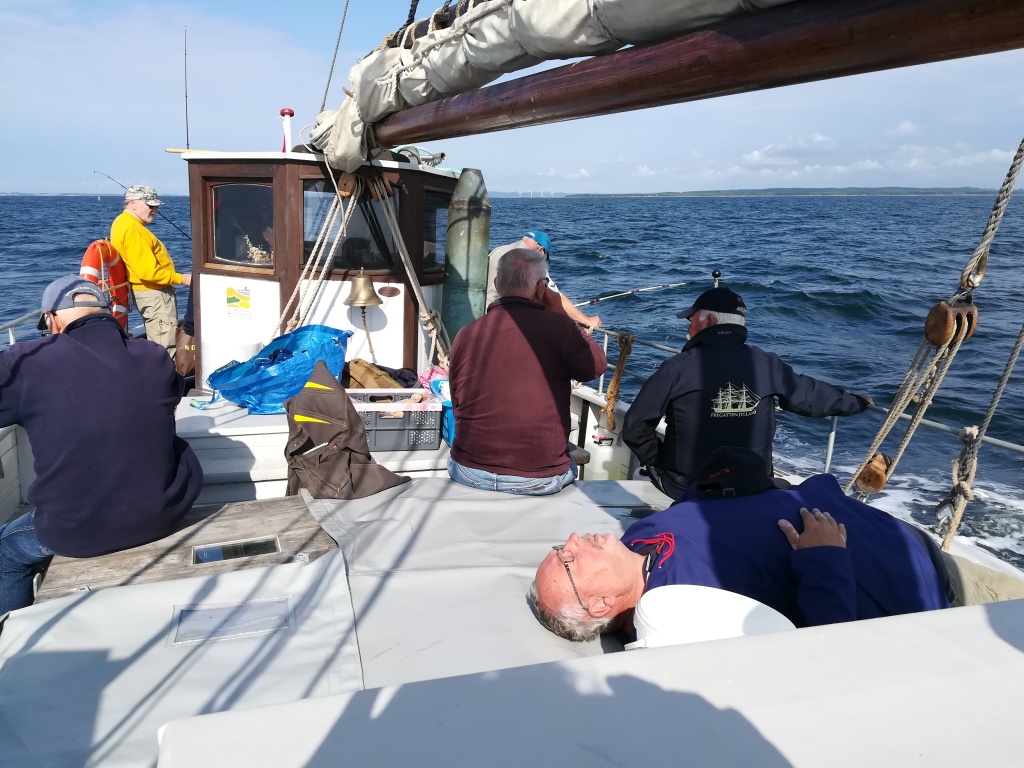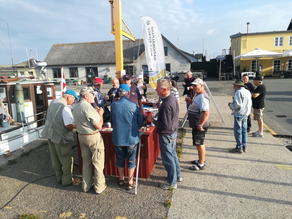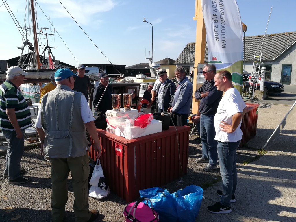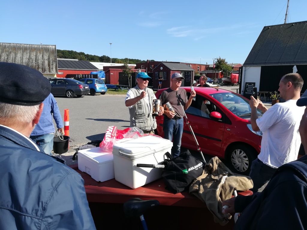 Seksten morgenfriske gaster (ud af 18 tilmeldte - efter 2 afbud) mødte op på fiskerihavnen i behørig tid inden kl. 08.00 for at indtage de to gode skibe, der skulle bringe gasterne ud til fiskepladserne: Veteranskibet "Skødshoved" og M/S "Hopla", - med h.h.v. Frank Heede og Kurt Nielsen som skippere.