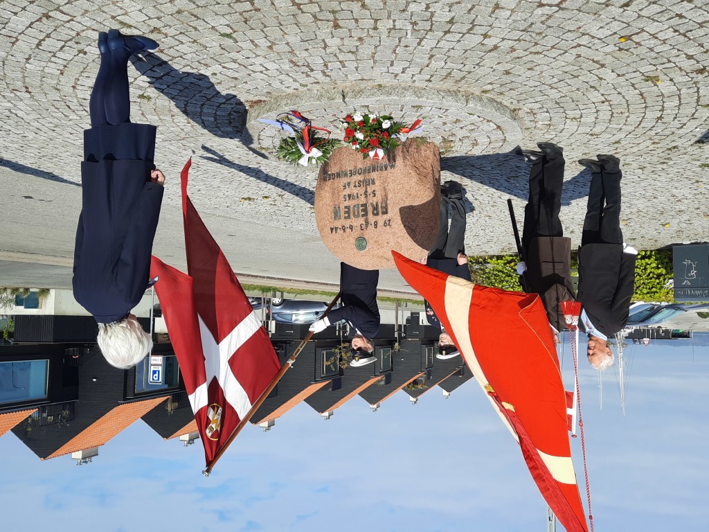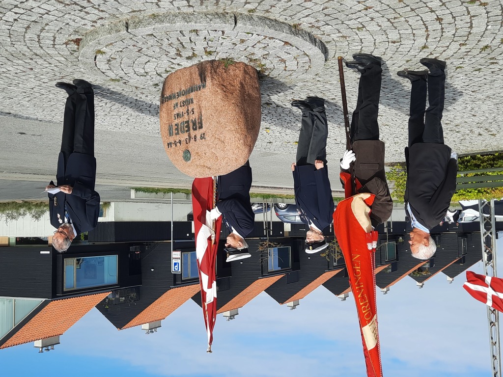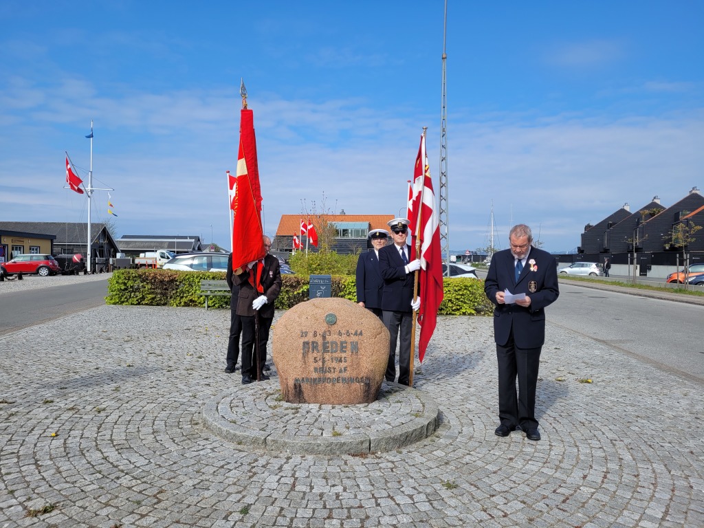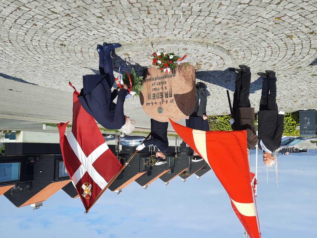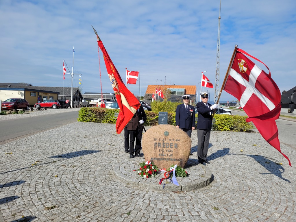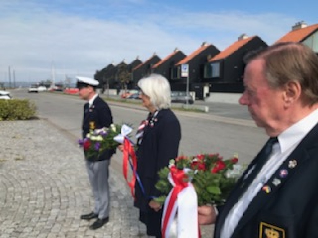 Næstformand Steen Knudsen lagde herefter en buket rød-hvide blomster ved stenen, hvorefter foreningens medlem, Kis Bødker, der er bestyrelsesmedlem i pårørendeforeningen for Danske Krigssejlere, lagde en buket i De Allieredes farver.